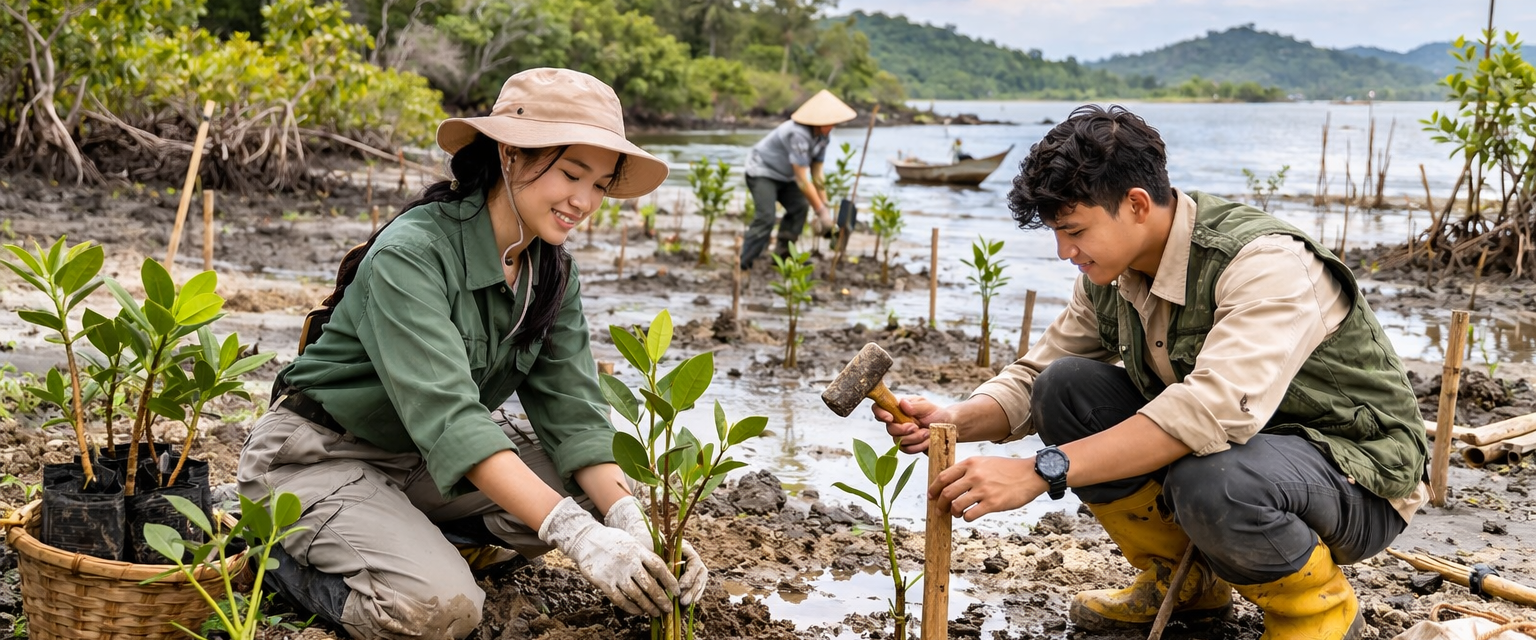 Pemulihan ekosistem darat dan pesisir dilakukan melalui rehabilitasi lingkungan, konservasi kawasan, serta penguatan partisipasi masyarakat dalam menjaga keseimbangan alam.